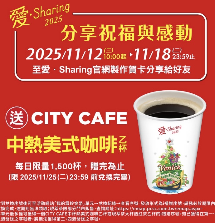 一週新的開始別錯過週一咖啡日優惠,全家與統一超商皆有優惠,還有持續進行中的咖啡分享季,整組購買優惠到11月21日,隨著愛.Sharing活動登場,也有線上製作賀卡送中杯美式咖啡的優惠,每週五六日更有酷聖霜例子提拉米蘇口味買1送1的優惠,一起筆記起來省荷包!