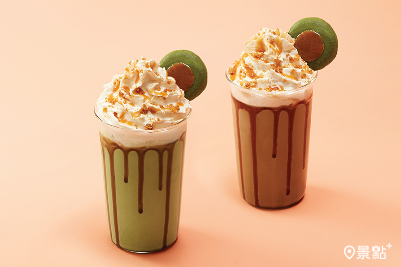 以現刷抹茶與焙茶拿鐵作為基底,頂層覆蓋綿密鮮奶油,淋上香濃太妃糖醬與焦糖脆餅碎粒,最後裝飾太妃糖抹茶軟餅乾,先喝一口風味拿鐵,感受茶香與太妃糖交織的獨特層次,接著吃一口沾裹太妃糖淋醬鮮奶油的抹茶軟餅乾,是冬季抹茶控與焙茶迷不可錯過的暖心飲品。