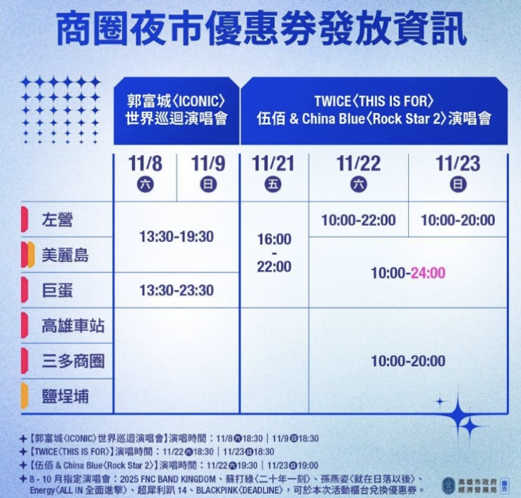 高雄市經發局補充,粉絲只要持指定演唱會門票即可至6處捷運站(左營、美麗島、巨蛋、三多商圈、鹽埕埔及高雄車站)兌換50元商圈夜市優惠券,並可用於高雄40+處商圈夜市及400+家精選店家。此外,夢時代、SKM PARK、漢神巨蛋、新光三越、高雄大遠百、SOGO、義大遊樂世界等百貨業者紛紛響應推出折價券、體驗券、各式折扣與精美好禮,讓樂迷享受更多加碼好康,同時11月21日在中央公園商圈也將舉辦「K-POP隨播即跳舞蹈大賽」舞蹈大賽,歡迎踴躍報名參與(報名網址https://forms.gle/946rNKbcnN297aJP9),提前感受音樂魅力。