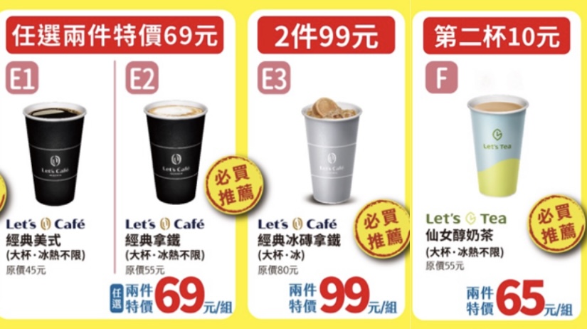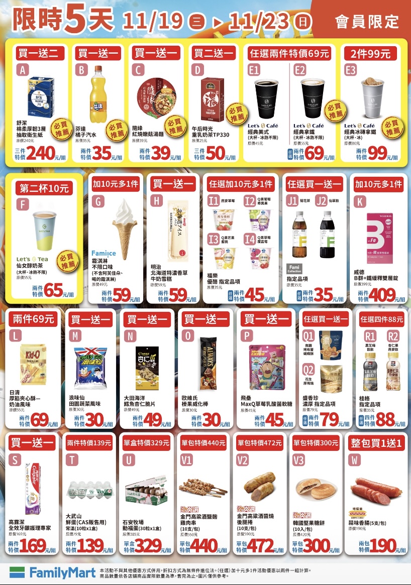 週三起跑的全家便利商店會員優惠,本週有大杯經典美式、大杯經典拿鐵任選兩件69元的優惠(如都選擇拿鐵品項就相當於第二件14元,逼近買一送一優惠),另有不倒翁金拉麵(杯裝)、農心辛拉麵也有買1送1的優惠,舒潔指定衛生紙買一送二串,這一週的Let's Cafe經典冰磚拿鐵兩杯特價99元(不限冰熱),仙女醇奶茶兩件特價65元(相當於第二杯10元),優惠至11月23日週日,優惠把握起來!