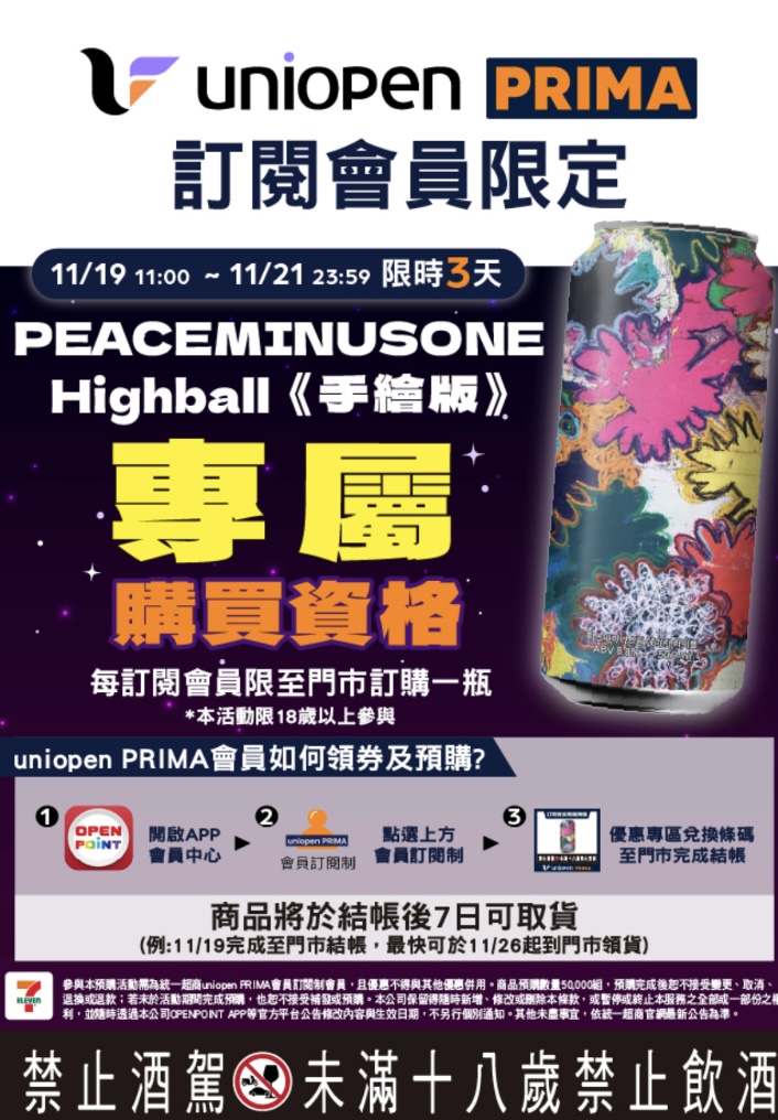 1.於活動期間內,uniopen PRIMA會員可前往 OPENPOINT APP 會員中心 →「uniopen PRIMA訂閱主頁」→「加碼優惠專區」領取「PEACEMINUSONE Highball第三款專屬購買資格券」(每會員限領1張、每張可預購1瓶)