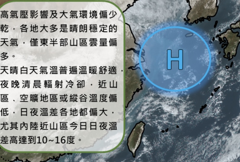 接下來這一週的天氣是舒適溫暖,不過要注意日夜溫差大,迎風面降雨逐漸增多,基隆北海岸、宜蘭及大臺北地區有局部短暫雨、花東及恆春半島也有零星降雨,週二起氣溫明顯降低,各地低溫約16至20度,日夜溫差大,早出晚歸要多添加衣物。
