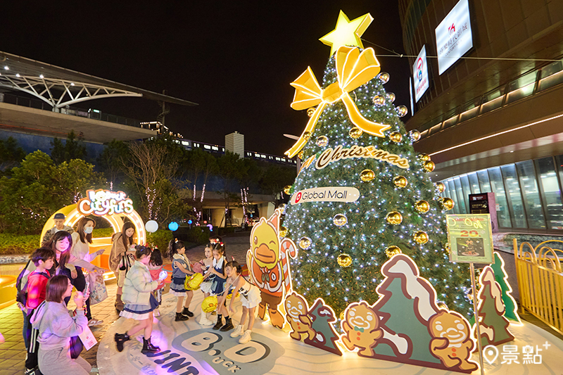 為迎接年末佳節、凝聚城市慶典氛圍特別策劃「20週年聖誕」活動,Global Mall桃園A19特別設立6米高B.Duck小黃鴨聖誕樹,俏皮的小黃鴨穿上可愛聖誕裝、手捧著拐杖糖,以水汪汪的眼睛與笑容療癒遊客們的心,搭配生動的小薑餅人陪伴嬉戲更增添童趣氣氛。