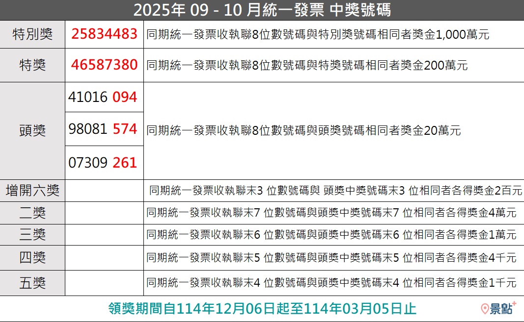 花64元買飲料鮮食中1000萬!發票對起來!2025年9 - 10月統一發票中獎號碼