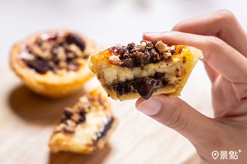第三層的是令人口齒留香的「流心小驚喜」:一口咬下蛋撻時,暖熱滑順的可可流心瞬間湧出、甜蜜暖心,為整體風味增添層次。