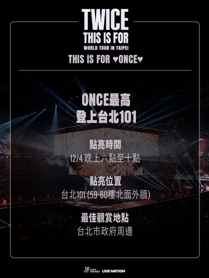 TWICE自從高雄演唱會後宣布台北大巨蛋也將展開兩場巡演,粉絲們熱烈期待、搶票,而台北101展開一連串聖誕跨年活動的同時,也緊緊抓住韓流K-POP的風潮,12月4日晚間將出現TWICE的特殊點燈,各位ONCE們別忘了接住TWICE準備的這份驚喜!