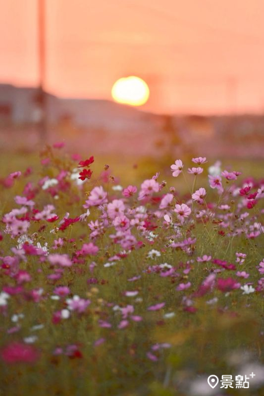 可於田埂間或借位取景滿版花海;或是在兩種不同花田的交界處,捕捉雙色美景;傍晚還有機會拍攝夕陽、花海同框畫面。