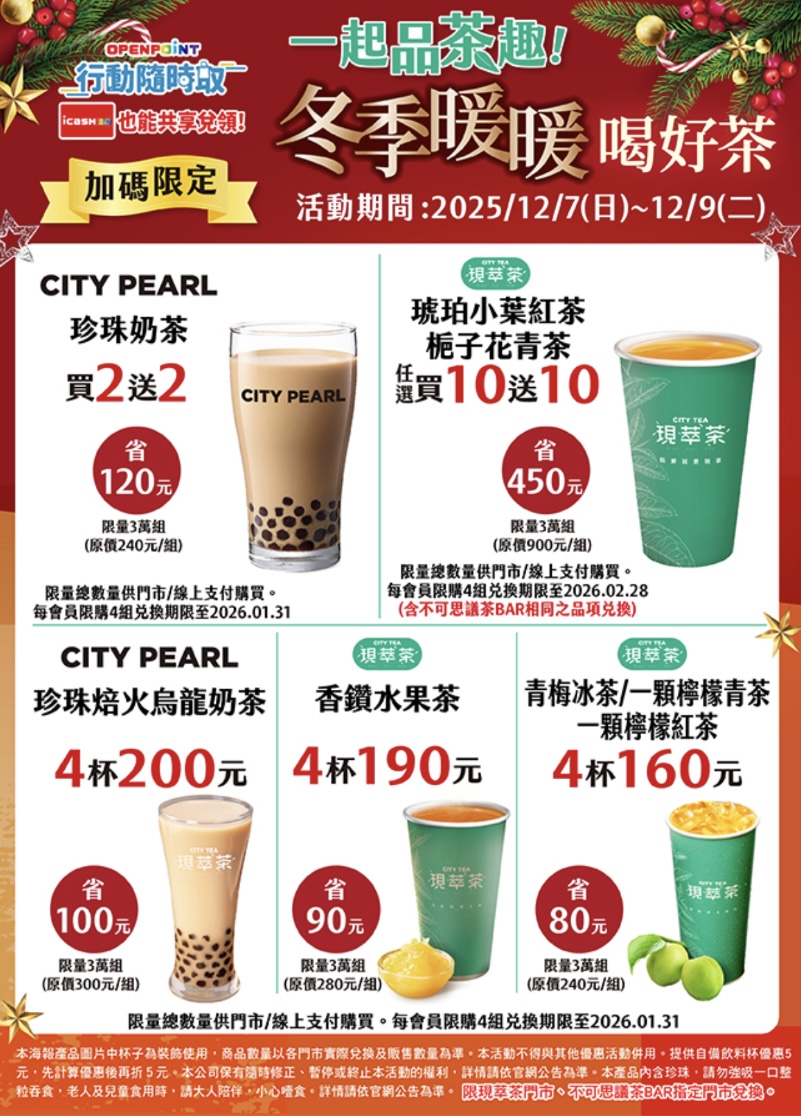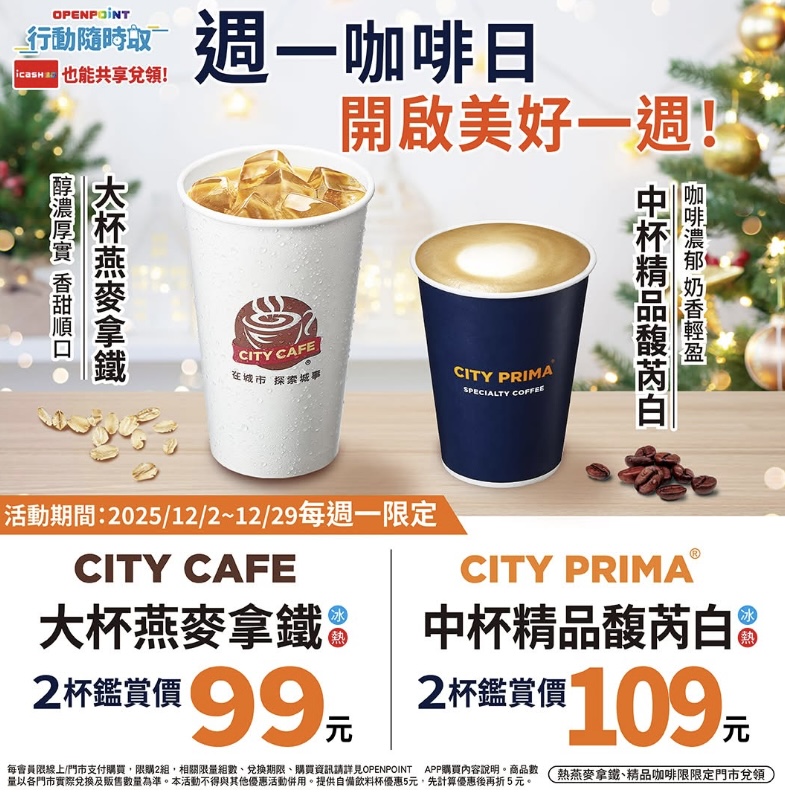 全家便利商店推出週一咖啡日優惠,第二件10元優惠直逼買一送一,透過跨店隨時取APP購入可寄杯,7-11也有週一咖啡日以及各種不同波段的整組購買優惠,包括「聖誕購物趴」、「愛Sharing分享日」、「一起品茶趣」整組購買咖啡茶飲優惠,注意不同活動的截止時間,趕快追起來!