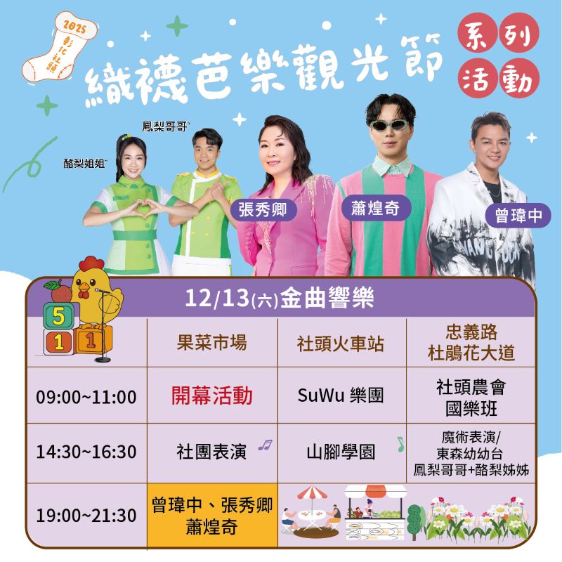 今年彰化社頭織襪芭樂觀光節晚會表演更是擴大舉辦,一連3天晚上都有超強卡司演出,邀請到曾心梅、陳孟賢、曾瑋中、張秀卿、蕭煌奇、芒果醬、麋先生等歌手及樂團。