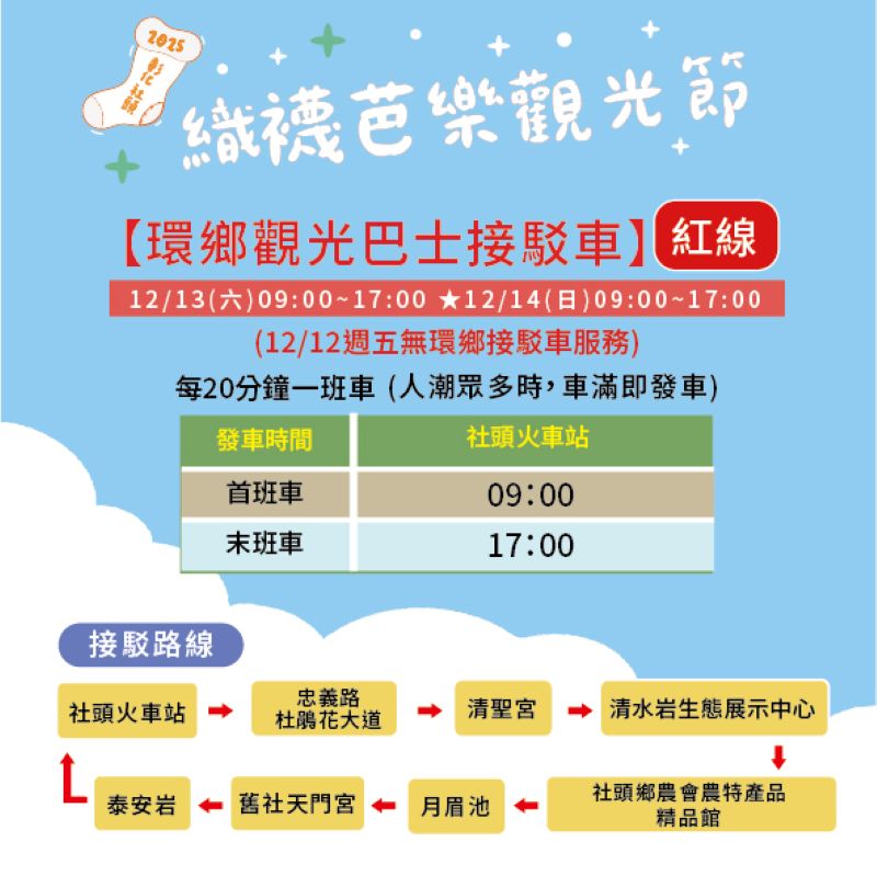 在主會場的部分,新雅路及員集路部分路段,在活動期間採單向通行並進行交通管制,另外12月13日、14日早上9點到下午5點,在杜鵑花大道設有「農產與文創市集」,因此上午7點至下午19點將實施道路單向封閉,