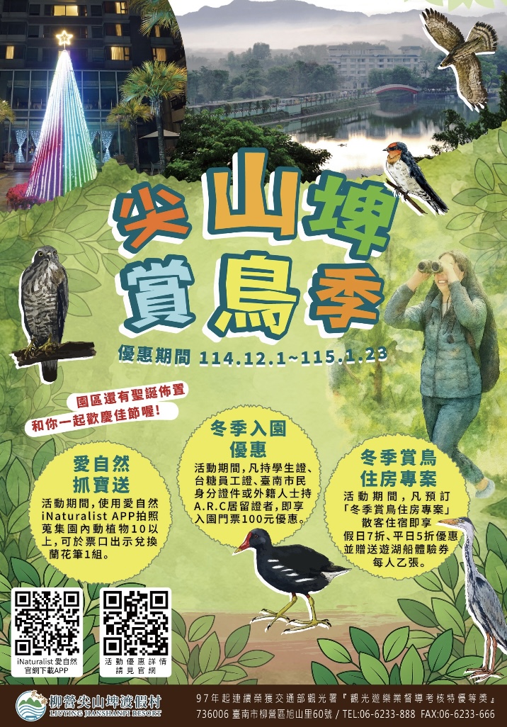 無論是家庭出遊、情侶約會或攝影寫生,這裡都是體驗冬日慢活的絕佳去處。在這個充滿溫度與生命力的季節,邀請您走進柳營尖山埤渡假村,感受自然的律動與人文的溫度。冬日不再寒冷,而是一段被鳥鳴與湖光溫柔包圍的幸福旅程,沉浸在自然美景的感動裡。