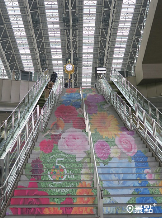 位於JR 大阪駅鐵道正上方的時空廣場也很推薦一定要一起造訪,連接南北棟的中央平台的時 空の広場,北高南低的傾斜坡度,半開放玻璃相間 的屋頂,絲絲縷縷的陽光傾瀉而下,廣場上著名的 地標金黃色的時鐘,宛如JR 大阪駅的時間守護者, 注視著熙來攘往的人們。