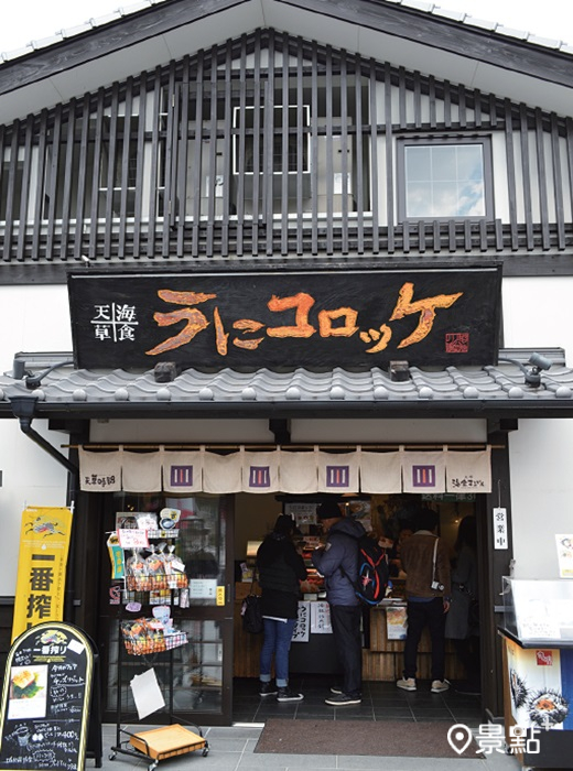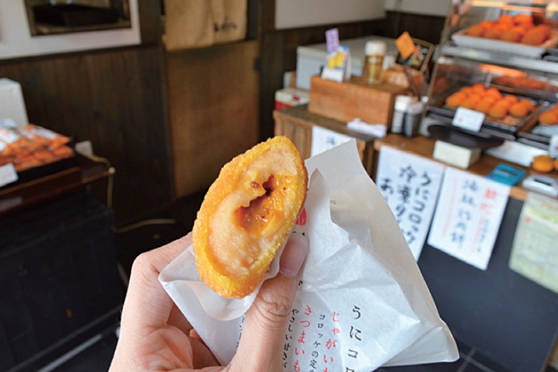 天草是熊本的外島,許多熊本人都會在週末時前往 度假,天草的海鮮更是十分出名。天草海食專門販 賣天草的海鮮料理,尤其是現炸的海膽可樂餅,炙 熱酥脆的外皮裡,濃郁鮮甜的海膽與馬鈴薯綿密口 感交織在口中。