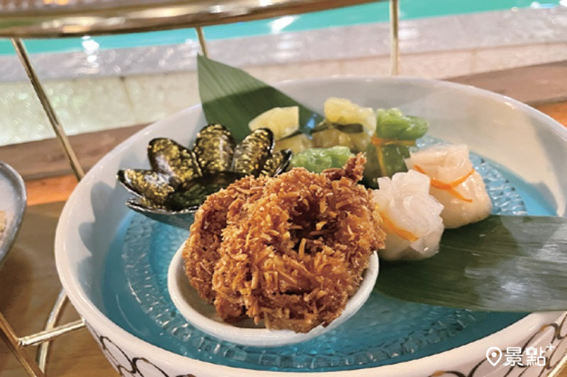 聖水最熱門的網紅餐廳非「saladaeng temple」莫屬,從需搭 乘接駁船進餐廳就話題十足,進入餐廳印入眼簾的就是大型的 佛像裝飾和充滿綠植的室內裝潢,而餐點的擺盤也是十分吸睛, 三層點心架的開胃小點是人氣菜單,口味也非常道地!