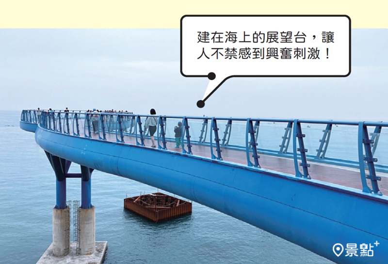 長達72.5 公尺、高約20 公尺的天空步道,猶如一 隻藍色的龍蜿蜒於海上,據說靈感正是來自守護青 沙浦的青龍。從橋上可以看到青沙浦站附近的紅燈塔,橋的一側設計了透明地板,讓遊客也能看看腳 底下的礁石。