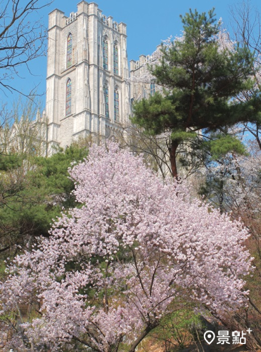 以哥德式建築校園聞名的慶熙大學,歐風建築讓校園壯闊優雅,特別是高聳的和平殿堂廣為眾人所知;而春天 一到,慶熙大學就成為熱門賞櫻名所,校園內種植眾多櫻花樹,粉嫩櫻花與哥德式建築相映成趣,堪稱是最美 麗校園之一。